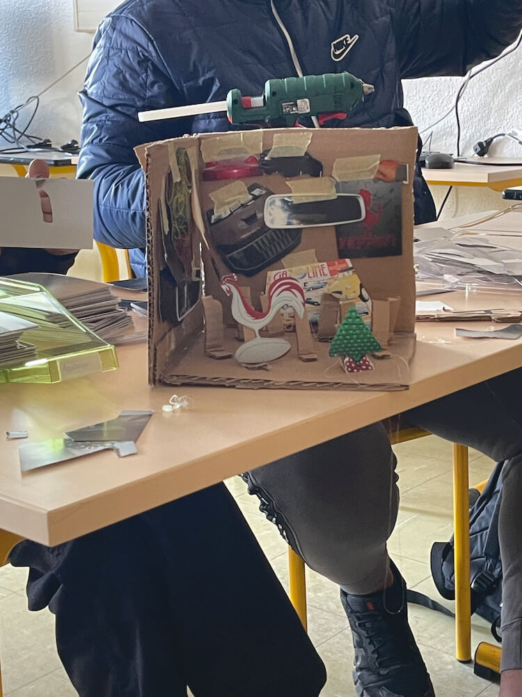 Puis, à partir de carton ou d’autres matériaux facilement disponibles, nous avons découpé quatre plaques de 20x20cm que nous avons assemblées pour construire un cube tridimensionnel avec une face ouverte. Les différents éléments découpés des photographies sont composés dans cet espace pour construire une scène en 3D. Les images ont été collées sur les parois intérieures, suspendues par le haut et placées n’importe où dans le cube.